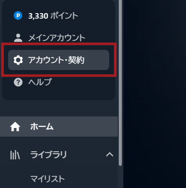 2️⃣ 左メニュー「アカウント・契約」をクリック
